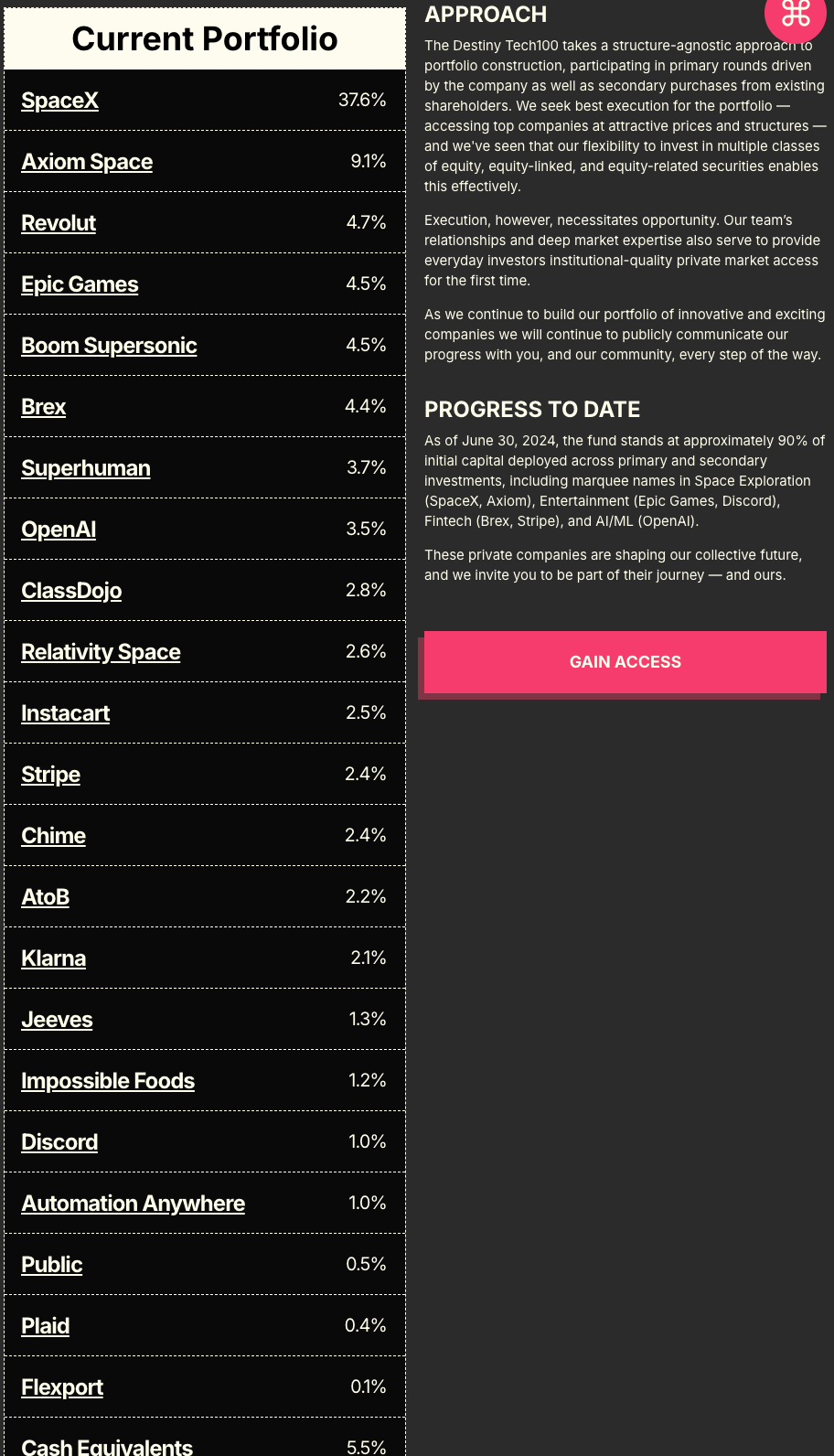 Destiny Tech100 is a closed-end management investment company registered under the 1940 Investment Company Act, designed to give outsiders like us our one shot at investing in a handpicked selection of private tech firms. The fund consists of 100 top-tier, venture-backed technology companies, all carefully vetted by institutional investors to ensure they’re financially stable, late-stage players. For those of us locked out of Silicon Valley’s inner circle, it’s a small chance to finally “be a part of it.”